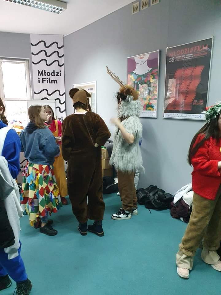 Prace rozpoczęli już w sobotę. Od rana przymiarka strojów, pakowanie pakietów z niespodziankami dla uczestników Filmoniady. Następnie uczniowie klasy 1C pomagali przy barwnym korowodzie, który przemaszerował ulicami Koszalina oraz przy warsztatach i seansach filmowych w CK105.